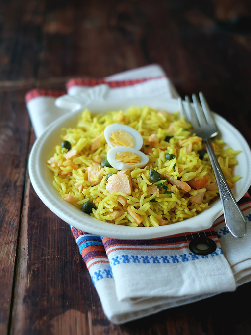 Lightly spiced fish and rice, served as a breakfast dish.